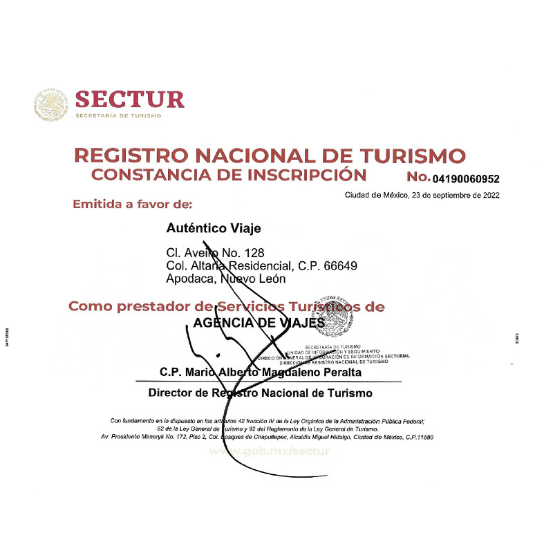 Contamos con el registro nacional de turismo (RNT) por parte de SECTUR. Asimismo, mantenemos relaciones comerciales con los operadores más seguros de la industria.